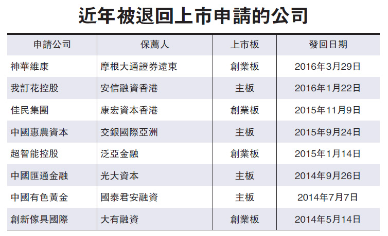 今次申請被退回的神華維康,其保薦人為摩根大通遠東則被連累。由於2014年實施新的上市保薦人新規後,被退回的申請會被刊登於聯交所的被發回清單上,申請公司以及其保薦人會被「永久」記在清單上,因此被投行形容為「name and shame」(記名及羞辱),摩根大通則成為首家被公開點名的國際投行。至今有8宗被發回的新股申請永久留名,4宗是主板申請,保薦人包括國泰君安融資、中國光大融資、交銀國際及安信融資;另外4宗是創業板申請,保薦人包括大有融資、泛亞金融、康宏資本及摩根大通。