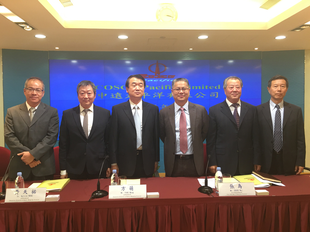 圖:中遠太平洋財務總監呂世傑(左起)、董事副總經理黃天祐、董事副總經理方萌、副主席兼董事總經理張為、董事副總經理鄧黃君、副總經理陳鏗/大公報記者 林靜文攝