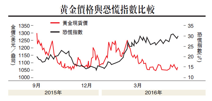 一般而言,每當市場風險升溫,黃金之避險功能將受到重視。不過,近期黃金價格與芝加哥期權交易所波動率指數(又稱恐慌指數)表現背離,黃金價格與波動率指數之間近期異常地呈現反向關係。我們預期全球經濟發展步伐持續令人失望,帶動商品價格及股市調整,故傾向認為踏入下半年,風險取態將明顯降溫。既然風險取態與金價之間已形成正向關係,這是否意味?金價將同樣迎來重大下調壓力?