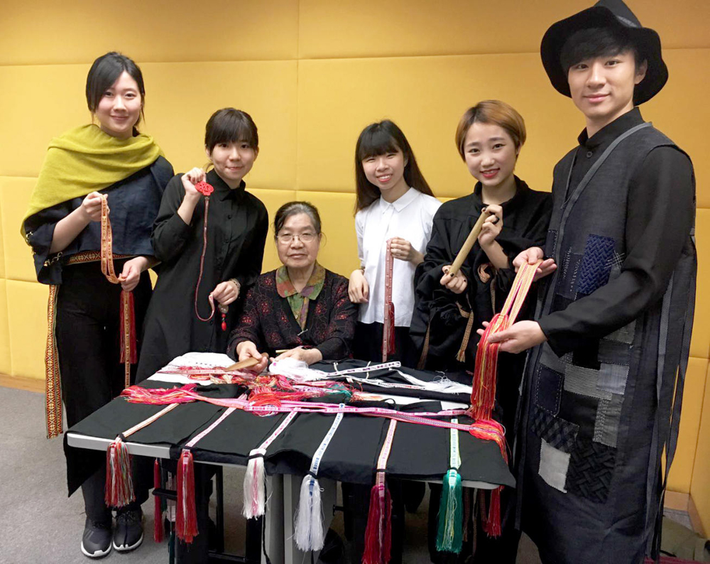 圖:(左三)客家婆婆「清姐」傳授「麻子花」及「攬子花」等織花技巧。同學們身穿的正是糅合了傳統客家特色與現代風采的作品