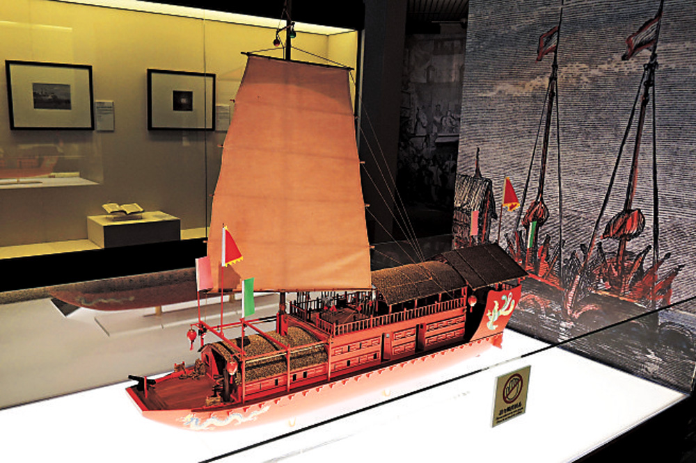 展覽中有一張由德國畫家Eduard Hildebrandt在澳門所繪的水彩畫,當時約在一八六五年,畫中可見媽閣廟前搭了戲棚,對開海面停泊了兩艘疑似紅船的船隻。昔日大型的紅船班有一對紅船,稱為天艇和地艇,現在只能從模型或繪圖中得知其規模了。