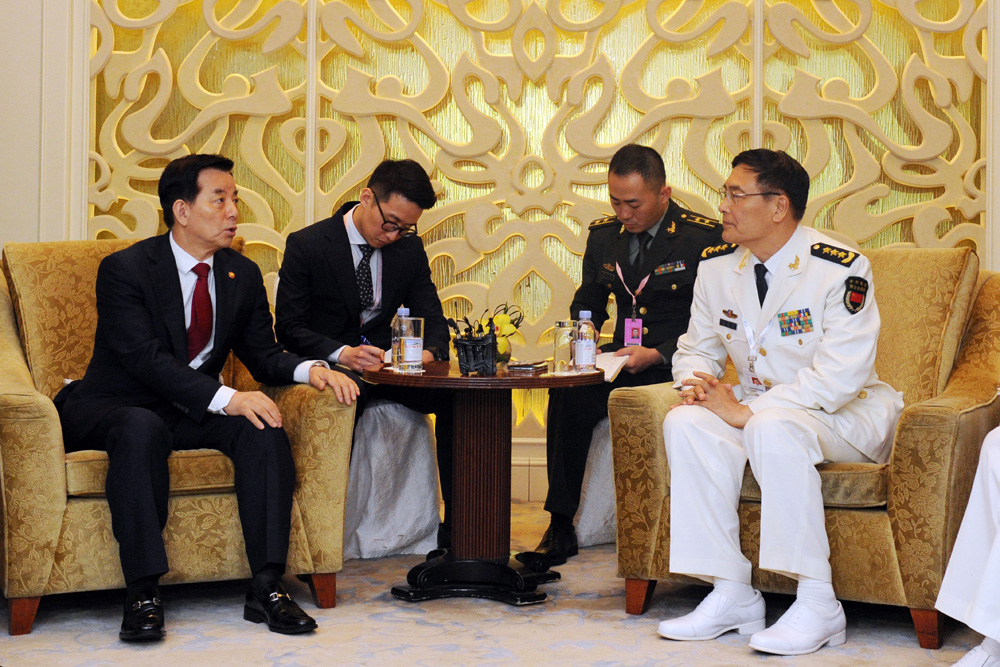 圖:孫建國(右一)4日會見韓國國防部長韓民求(左一)\新華社