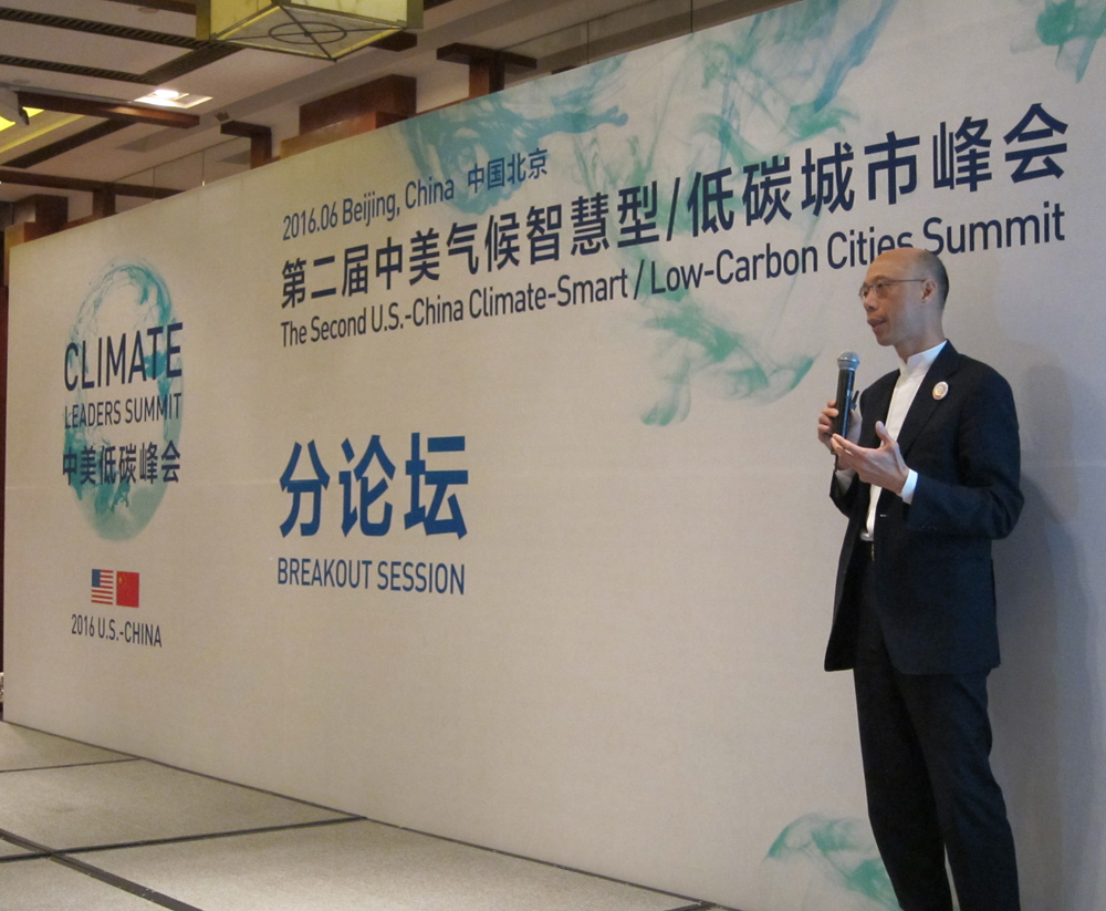 環境局局長黃錦星昨日在北京出席第二屆中美氣候智慧型╱低碳城市峰會,並在一個分論壇上發表主題演講,簡介香港特別行政區政府應對氣候變化的最新發展。圖為黃錦星在分論壇上了解其他地方建設低碳城市的規劃和經驗。