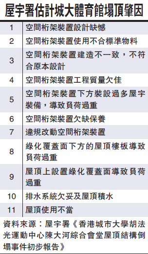 □屋宇署公布城市大學胡法光運動中心塌屋頂事故調查初步報告,揭露肇事原因除了綠化天台工程外,原有屋頂結構亦可能「先天不足」,或存在設計缺陷、工程質量欠佳等問題,而綠化覆蓋面下方屋頂樓板厚度及物料,亦被發現與屋宇署記錄批准圖則不同。屋宇署將循十一個肇事原因深入調查,料三個月內完成最終報告。\大公報記者 曾敏捷