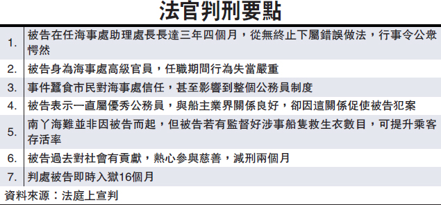 法官續指,香港公務員是以廉正及效率見稱,但是次案件顯然會令公眾對海事處失去信心,更會深遠影響整個公務員架構,故採納十八個月監禁為量刑起點,但鑒於被告是優秀公務員、對海事處貢獻良多、受到同事尊敬等求情理由,因此決定扣減兩個月刑期,判被告入獄十六個月。