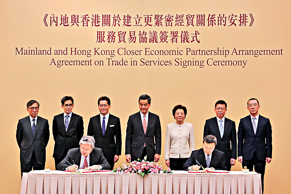 2003年,在香港回歸六周年之際,中央政府響應香港提議,簽署了CEPA,此舉極大地提升了香港商界信心,香港經濟開始明顯復甦。2015年,在CEPA框架下簽署的《服務貿易協議》讓內地與香港基本實現服務貿易自由化,令兩地的開放服務貿易達到新的里程碑。是次的補充協議也被稱為「最強CEPA」。