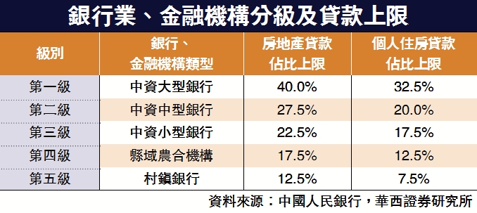 根據要求,中資大型銀行房地產貸款餘額佔比為40%、中資中型銀行為27.5%。而對於個人住房貸款佔比上限,中資大型銀行為32.5%、中資中型銀行為20%。