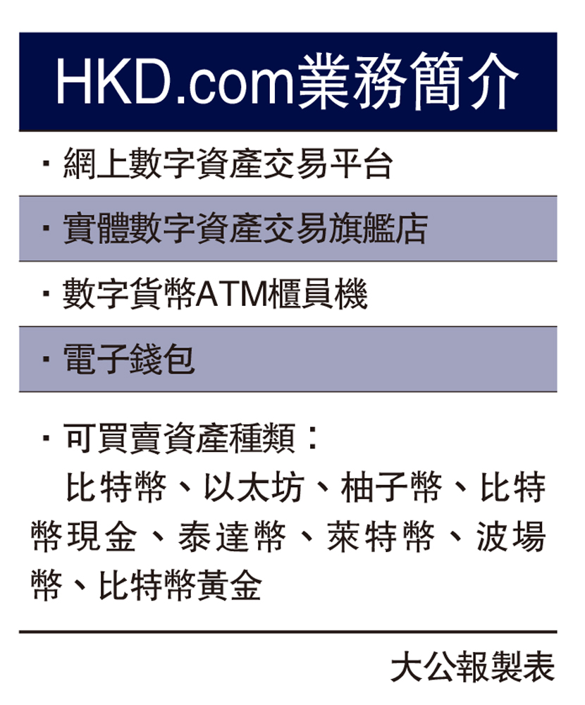 HKD.com去年9月已開通24小時的網上交易平台,而新設的實體交易將提供即時開戶及轉賬、數字貨幣錢包增值、買賣數字貨幣等業務,同時交易中設有自動櫃員機,讓客戶買賣虛擬貨幣,但設有最低交易額100元,並不設手續費。
