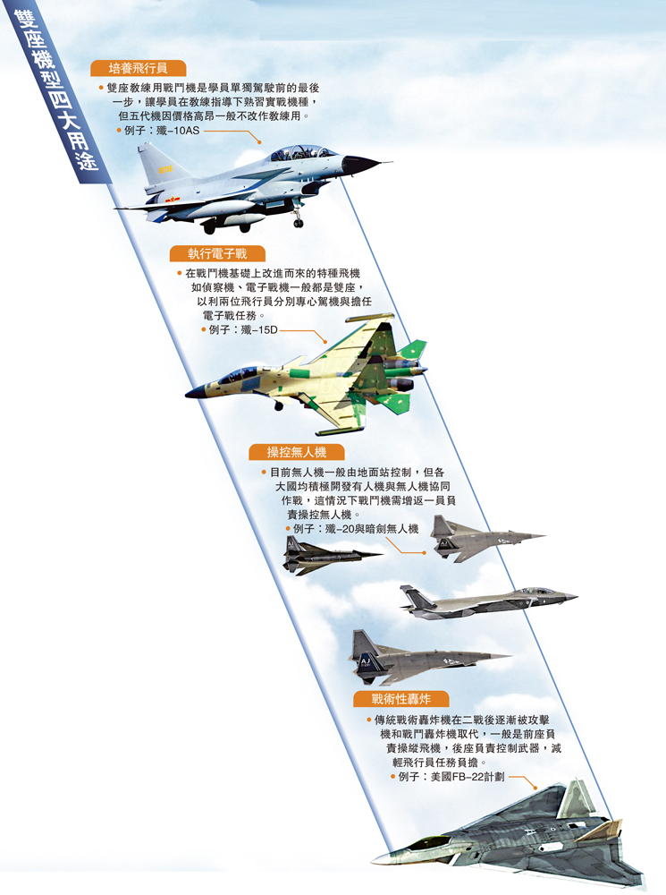 •雙座教練用戰鬥機是學員單獨駕駛前的最後一步,讓學員在教練指導下熟習實戰機種,但五代機因價格高昂一般不改作教練用。