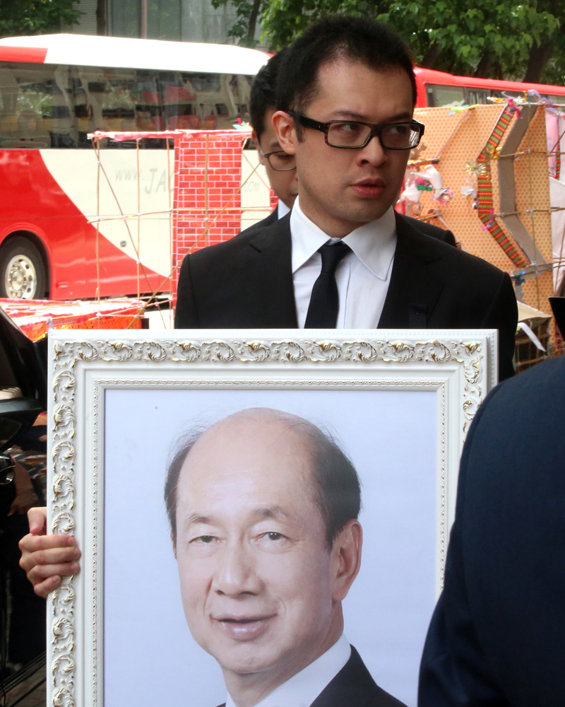 圖:劉展灝舉殯,長子劉燊濤拿?亡父照片離開靈堂 大公報記者麥潤田攝