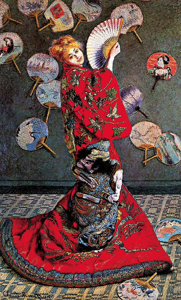 而《穿和服的女子》是莫奈一八七六年以妻子為原型創作的作品,畫中女子穿?和服,手拿摺扇,背對觀者卻回望畫外,她的金髮顯示出西方人身份。畫中藍灰色的背景與鮮艷的紅色和服相對比,金色的頭髮與和服上的金色刺繡相映襯,色彩鮮艷、明麗;還有牆壁上和地上的日本團扇、和服上的武士等等都顯示出各種日本元素,描繪細緻入微的日式榻榻米也體現了畫家的功力。雖然畫作處處顯示日本情調,但東西方藝術的融合並不能只靠這些物品來體現,這幅畫仍保持了歐洲繪畫的傳統。