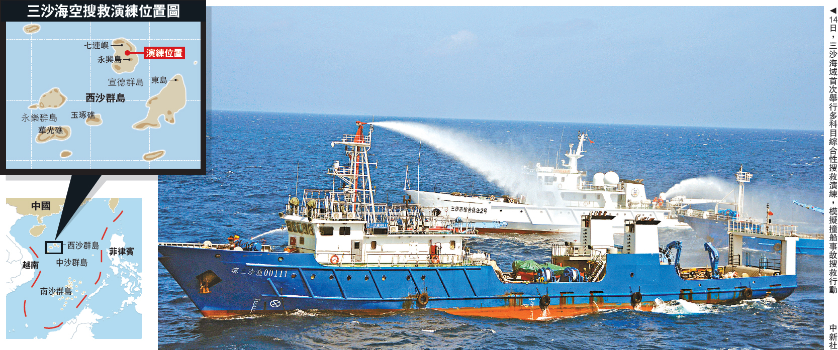 圖:14日,三沙海域首次舉行多科目綜合性搜救演練,模擬撞船事故搜救行動 /中新社