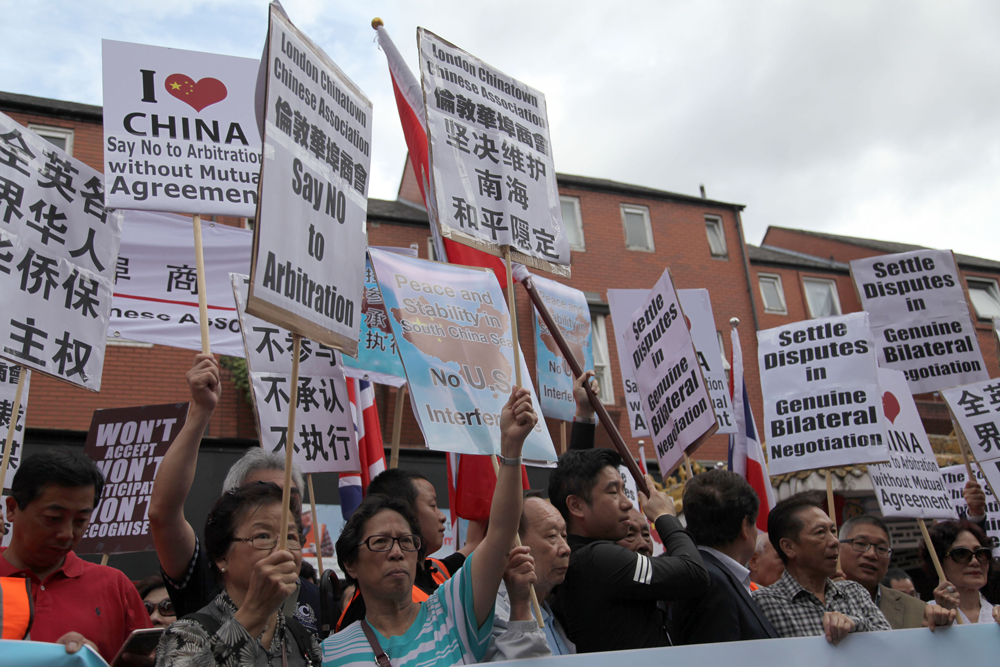 來自英國各地的華人華僑16日在倫敦舉行大規模示威遊行,抗議菲律賓南海仲裁案仲裁庭的非法、無效裁決,支持中國政府不接受、不承認的立場,並向菲律賓和美國駐英國使館遞交抗議信。