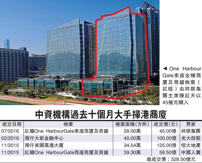 □中央提倡「一帶一路」經濟發展國策,惠及香港商廈。中資企業近年大舉進軍本港甲級商廈市場,連同最新由深圳祥祺集團斥45億元向會德豐(00020)購入紅磡商廈在內,過去十個月內地國企及中資財團,已花近329億元狂掃本港甲級商廈。/大公報記者 林志光