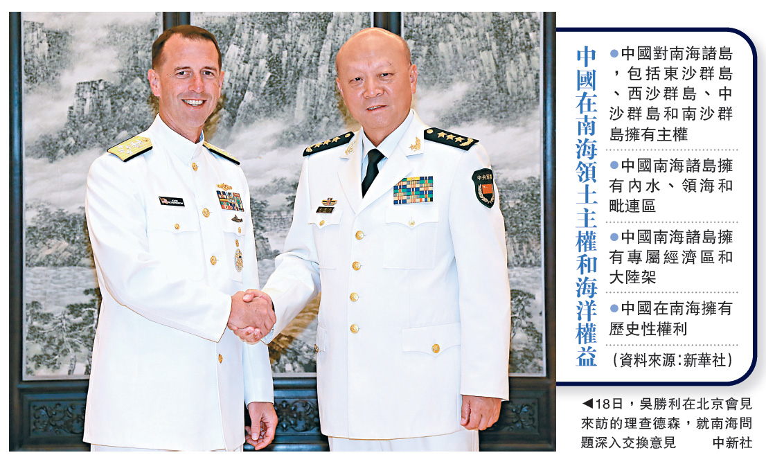 【大公報訊】據中新社報道:中國海軍司令員吳勝利18日在北京會見來訪的美國海軍作戰部長約翰理查德森一行,就共同關注的海上安全問題,特別是南海問題深入交換意見。