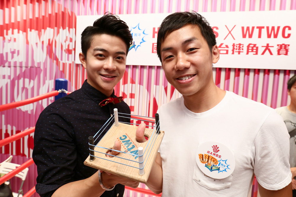 圖:香港拳王曹星如(右)試玩手指擂台摔角