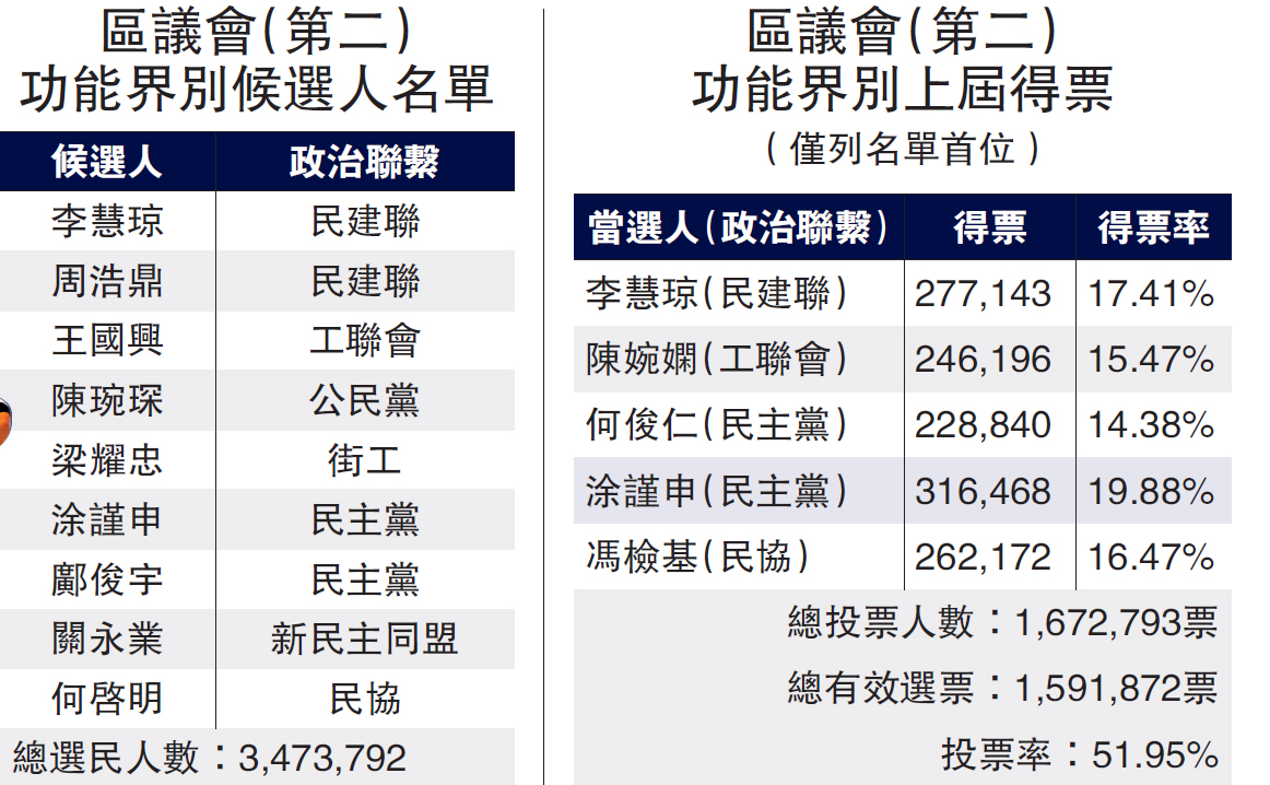 有近350萬選民的「超級區議員」,由於得票高,認受性大,成為兵家必爭之地。上屆選舉首設「超區」議席,建制派方面,民建聯李慧琼和工聯會陳婉嫻各取一席,加上落選的劉江華和白韻琹,建制派共取得逾78萬票,得票率約49%。其餘三席被民主黨何俊仁、涂謹申及民協馮檢基瓜分,三張名單共取得80多萬張選票,得票率約51%。