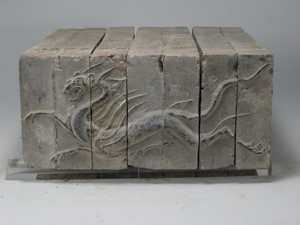 由七塊並列的長方體磚組合成的龍紋磚,分段模印組合而成,高16.5厘米、寬35.2厘米、長34厘米。龍昂首,嘴巴大張,長舌外露,靈活的身體彎曲成S形,呈現出凌空騰飛之勢,展示出身份尊貴的瑞獸氣勢。