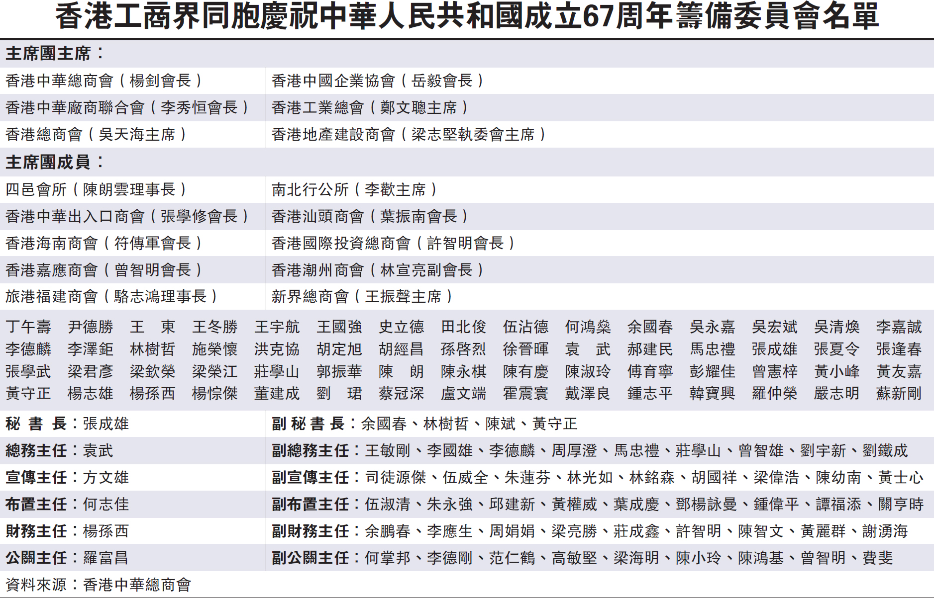 □「香港工商界同胞慶祝中華人民共和國成立67周年籌備委員會」昨日舉行成立大會,會上通過於9月26日舉行慶祝67周年國慶酒會。籌委會執行主席楊釗呼籲社會各界團結一致,全力支持特區政府,發展經濟、改善民生,攜手構建和諧香港。中聯辦副主任殷曉靜勉勵香港工商界,進一步找準「國家所需,香港所長」的結合點,創造新的奇跡與輝煌。\大公報記者 文 軒