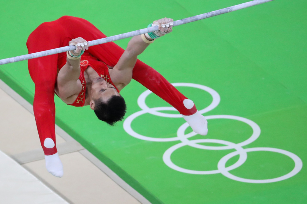 圖:中國體操隊隊員張成龍在單槓訓練中\新華社