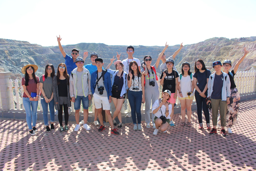 圖:「范長江行動甘肅行」傳媒學子在白銀公司2號露天礦場邊合影\大公報實習記者苗田攝