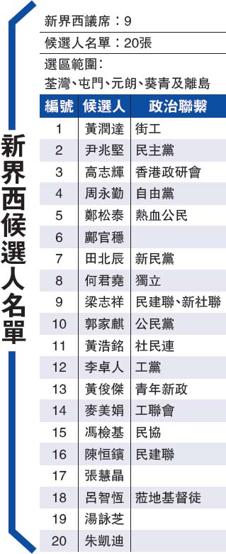 新界西直選的候選名單還有:張慧晶、鄺官穩、周永勤、朱凱迪、湯詠芝、高志輝及呂智恆。