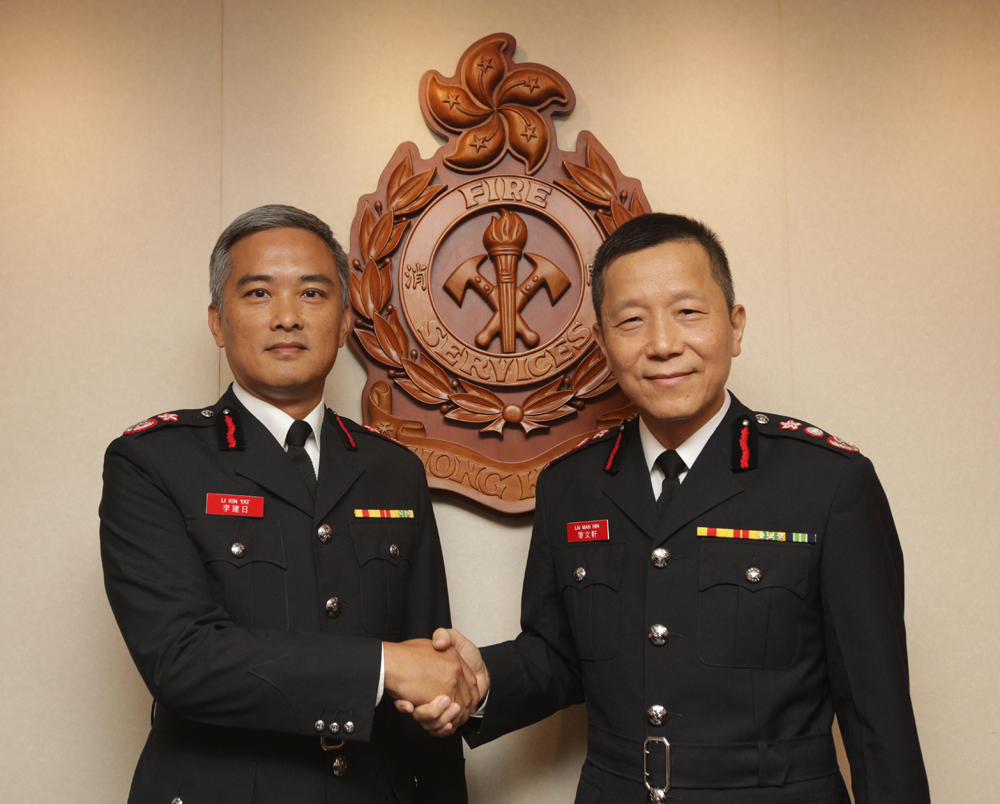 圖:即將於本周退休的消防處處長黎文軒(右),昨日與候任處長李建日(左)會見傳媒」大公報記者林少權攝