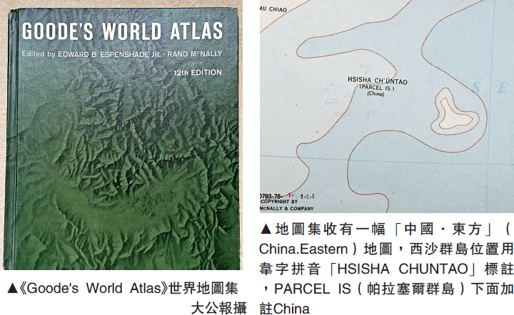第一本名叫《Goode's World Atlas》世界地圖集,為John Paul Goode於1922年編輯,由美國最著名的地圖公司Rand McNally出第一版,鄭海麟購得的為第十二版。該地圖集收有一幅「中國·東方」(China.Eastern)地圖,其中在南中國海(South China Sea)的西沙群島位置用韋字拼音「HSISHA CHUNTAO」標註,下面註有英文PARCEL IS(帕拉塞爾群島),在PARCEL IS下面加註China,明顯將其認定為中國領土。另在菲律賓地圖方面,明顯可見菲律賓版圖內並不包括黃岩島,也不包括南沙群島任何島礁。