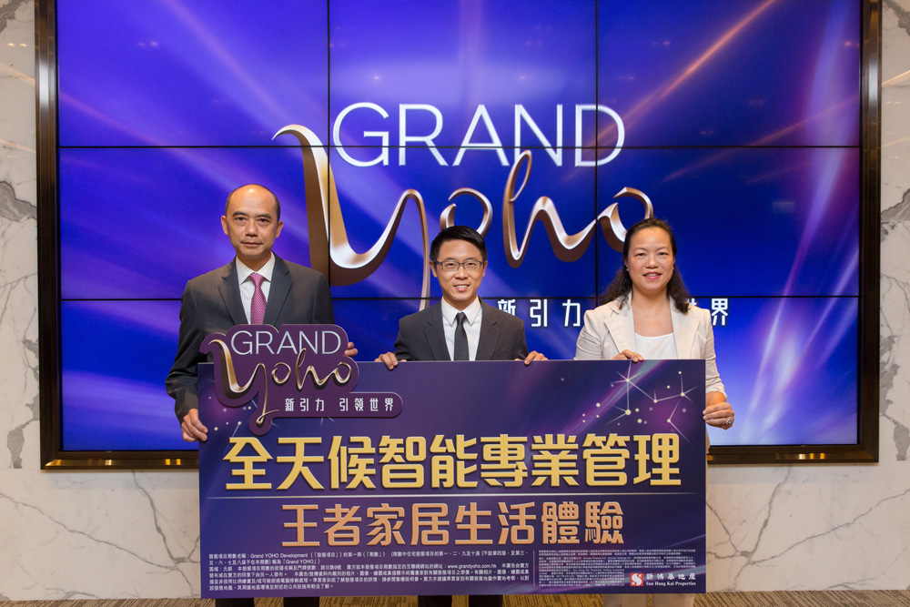 圖:Grand YOHO第一期委任啟勝為項目物管,並獲洗衣公司提供服務。胡致遠(中)聯同啟勝管理服務總經理(物業管理)陳成威(左)及陽光洗衣集團總監江麗萍公布服務詳情