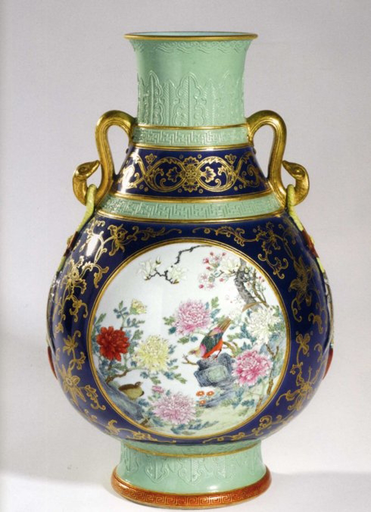 圖:拍出一千八百萬美元的民國霽藍描金開光粉彩花鳥暗刻松石綠釉如意雙耳尊