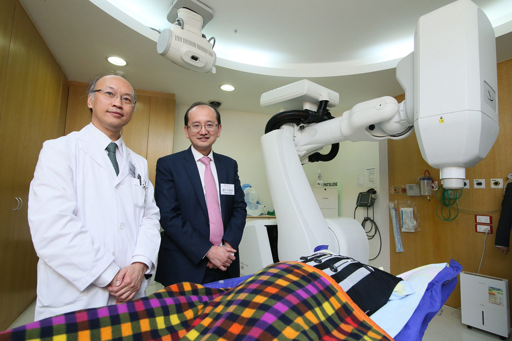 圖:潘東平(右)與羅振基介紹新型放射治療儀器「數碼導航刀」