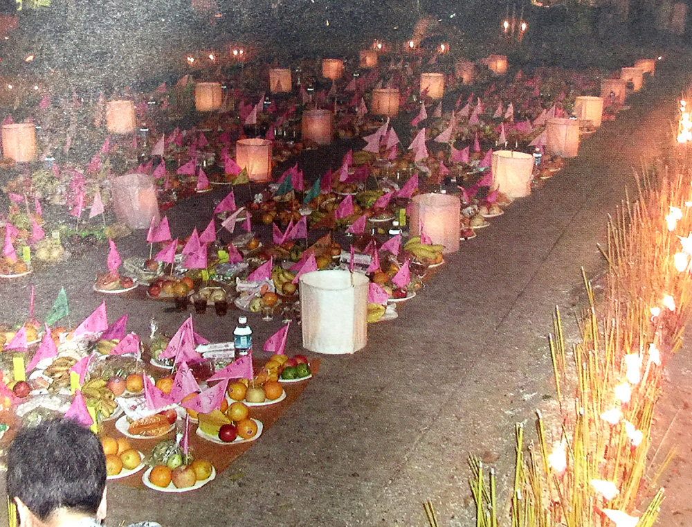 圖為「天席」,意為給孤魂吃的酒席,祭品上插小旗並寫上名字,以示誰人行善,讓鬼神垂鑒