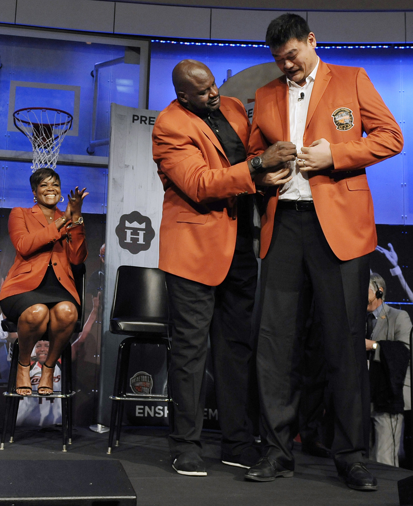 美國籃球「名人堂」昨天為3位NBA球星姚明、「巨鯊」奧尼爾、艾佛遜舉行「加冕」儀式和記者會。姚明和奧尼爾老對手重逢分外開心,見主持人無法為身高2米28的姚明穿上名人標誌的橘夾克,身高215公分的「巨鯊」挺身而出代勞,再相互握手致意,引發全場歡笑 美聯社