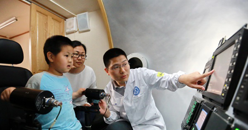 圖:在中國航天科技集團公司展廳,小朋友體驗航天員手控交會對接過程 網絡圖片