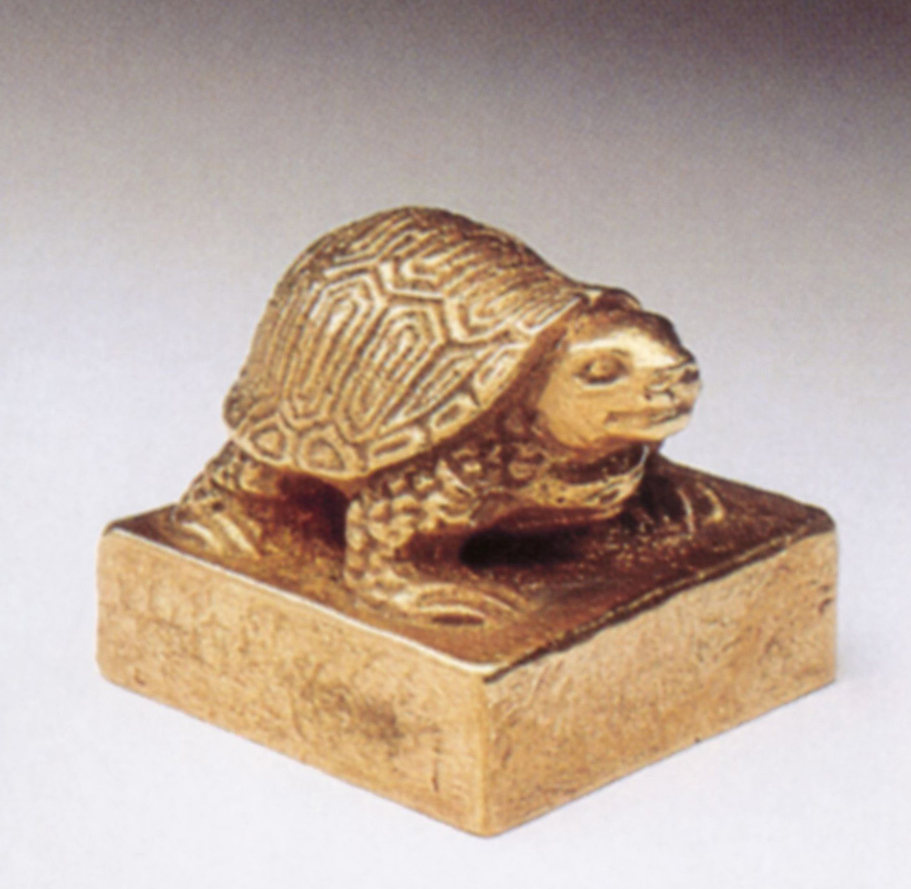 附圖為漢代所鑄造龜鈕黃金小方印,乃屬我國珍貴文物之一;龜首、肢體及甲殼紋飾細緻清晰,神態活現。