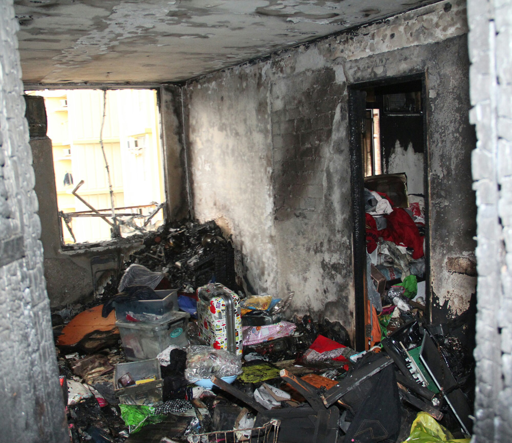 【大公報訊】沙田大圍美田?美庭樓一單位,昨凌晨突然冒煙起火,單位內女戶主被濃煙嗆醒,立即報警及帶同孫兒逃生。但火勢一發不可收拾,全屋陷入火海,消防員接報到場約一小時後將火警救熄,火警中肇事單位女戶主及一名男鄰居吸入濃煙不適要送院,現場約有300人一度疏散,消防員調查後相信單位內一部手提真空吸塵機電器短路導致火警,起火原因無可疑,但涉事單位付之一炬,女戶主出院後面對嚴重焚毀的居所一臉哀愁。