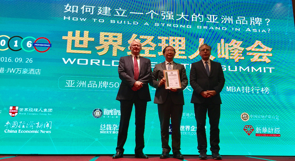 圖:耶魯大學管理學院教授萊維·多爾(右)、哈佛大學商學院資深教授約翰·戴騰(左)向本報代表田志偉(中)頒發《亞洲品牌500強》證書