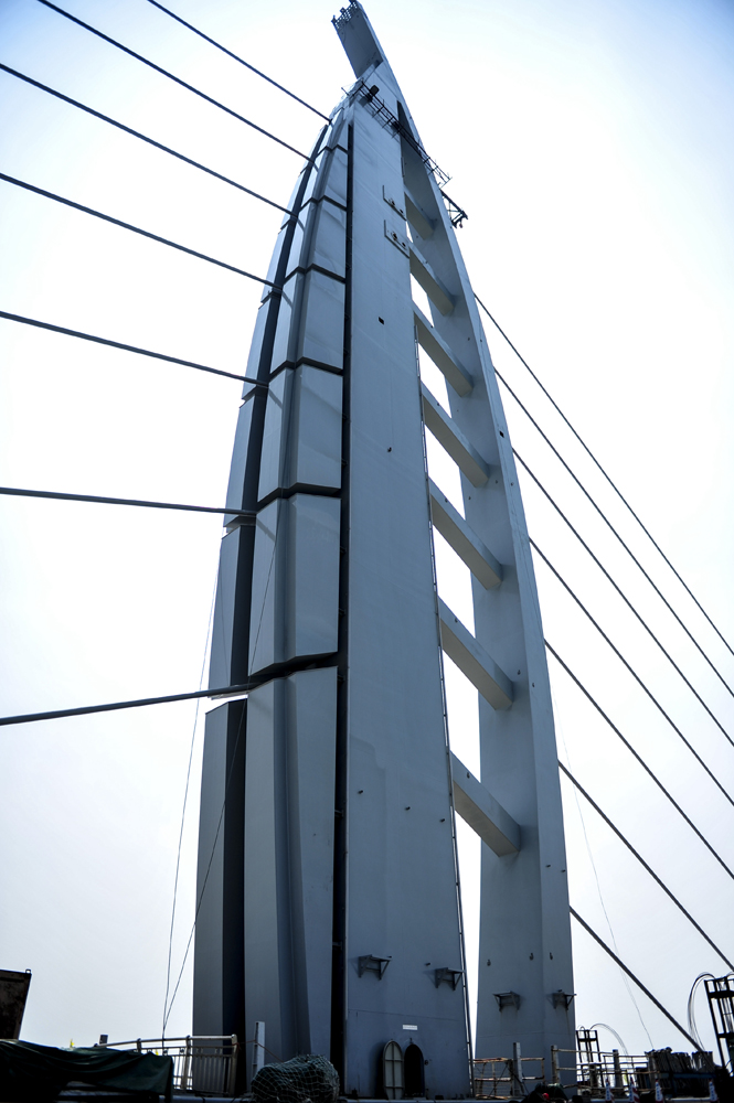 圖:江海直達船航道橋「海豚」:採用中央平行單索面三鋼塔鋼箱樑主樑斜拉橋方案,中間雙孔跨徑最大為258米,兩個邊索塔「海豚」和中索塔「海豚」的高度分別為108.5米和109.756米,重達2600噸