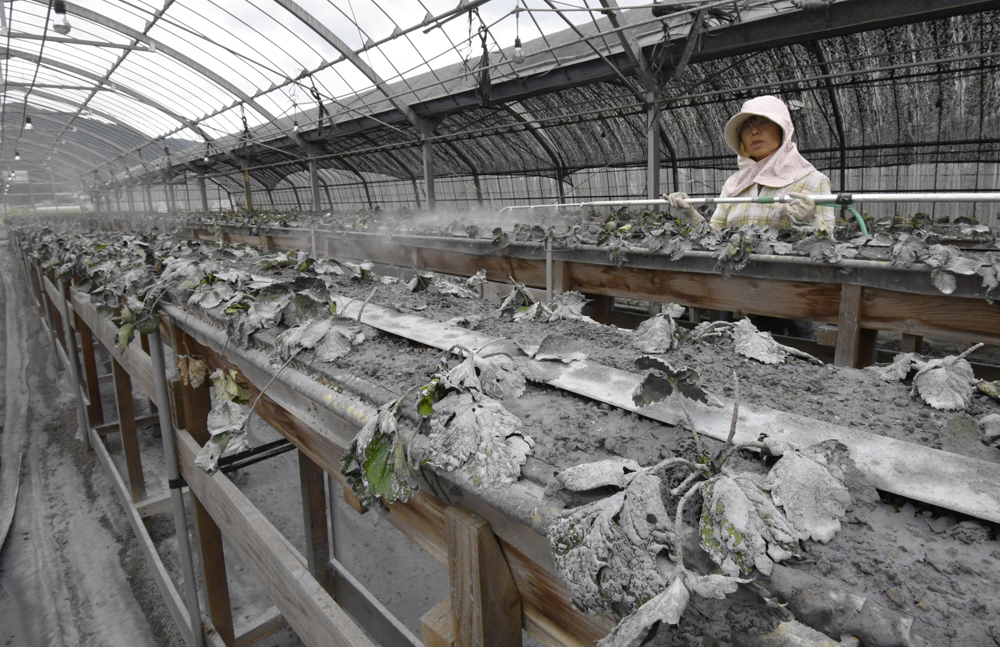 圖:一位草莓種植者正在向農作物噴水,以清理厚厚的火山灰\美聯社