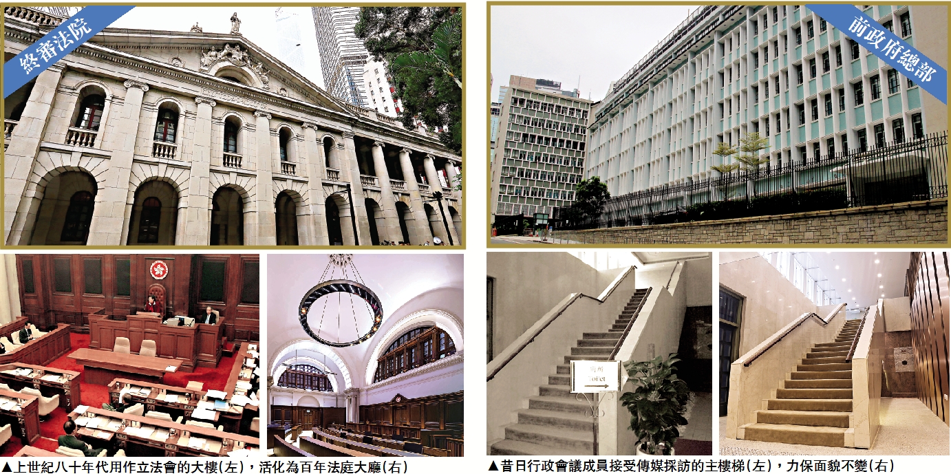□中區兩幢地標建築──終審法院大樓、前政府總部陸續完成活化,獲評為法定古蹟的終審法院活化百年法庭大廳,僅靠兩幅照片重現舊貌。年逾半百的前政府總部內的11條樓梯,包括昔日行政會議成員於會議前後接受傳媒採訪、俗稱「扑咪位」所在的主樓梯,如何力保經典面貌不變,同時符合現今建築物條例標準,留住港人集體回憶,活化方案考起建築師。負責今次保育工程的建築署建築師形容,保育歷史建築儼如做「哲學題」,沒有標準答案,克服三大難關要情理兼備。/大公報記者 曾敏捷 (文) 麥潤田 蔡文豪 (圖) 部分相片由建築署提供