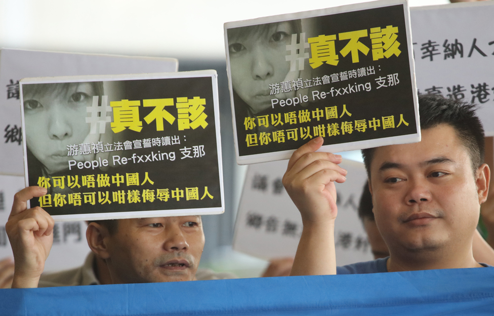 □青年新政梁頌恆、游蕙禎前日在議員宣誓儀式上公然辱華、「宣獨」及爆粗,激起市民強烈憤慨。特區政府昨發聲明予以譴責,批評部分人的表現有損立法會議員尊嚴,其言行傷害國人感情。有政黨要求執法部門調查梁頌恆、游蕙禎參選時是否有作出虛假的法定聲明。香港市民亦以各種形式表達不滿。逾三萬市民在網上聯署對游蕙禎予以譴責,要求游蕙禎公開道歉並收回侮辱及歧視中國人言論。亦有市民到立法會外抗議或致電電台,痛斥梁、游二人根本沒資格代表香港人做議員。/大公報記者 龔學鳴