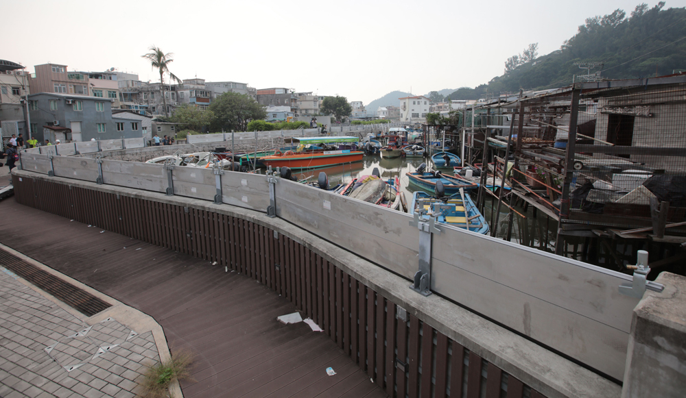 圖:渠務署派員到大澳,在防洪河堤加裝可拆卸式防洪屏障/大公報記者林少權攝