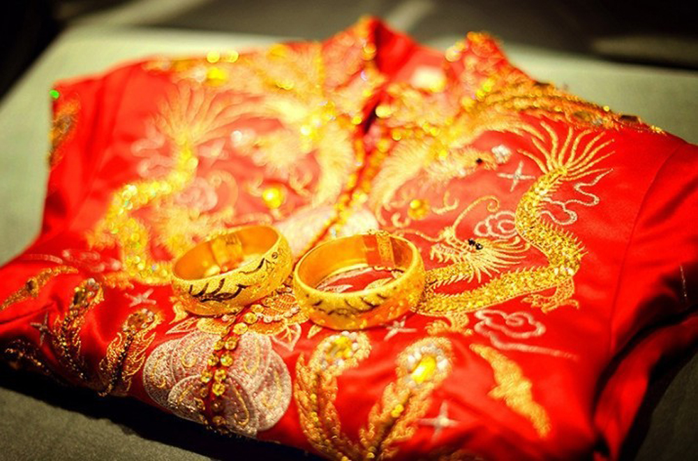 香港中西文化交融,生活習慣中西並用。西式婚禮,穿長裙婚紗。中式婚禮穿的是傳統裙褂,所謂裙褂,是裙子配搭一件上身對衿的禮服,圓領寬身,習稱為褂。中式婚服的裙褂,以紅為主色,手工十分講究,用金銀線或膠片繡上龍鳳圖案,莊重華麗。