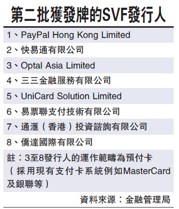 金管局再批八儲值支付牌