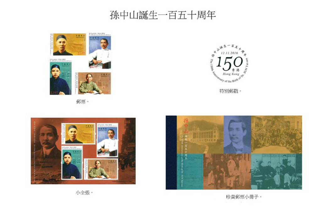 孫中山同香港淵源深厚,唔單止喺香港接受教育,仲喺度萌生革命思想,香港呢一套四枚郵票,以油畫方式描繪不同時期嘅孫中山,包括1.7元嘅求學時期、2.9元嘅青年時期、3.7元嘅中年時期同埋五元嘅晚年時期,背景配合不同嘅建築物,以反映佢喺香港留下嘅足跡。