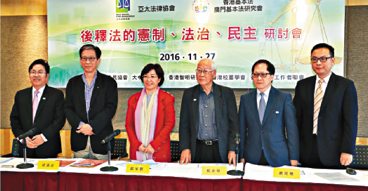 亞太法律協會、香港基本法澳門基本法研究會昨舉辦研討會,探討後釋法的憲制、法治及民主,出席嘉賓包括胡漢清、前中大政治及行政學系主任鄭赤琰、鄒平學、香港公開大學人文社會科學院教授趙雨樂等。