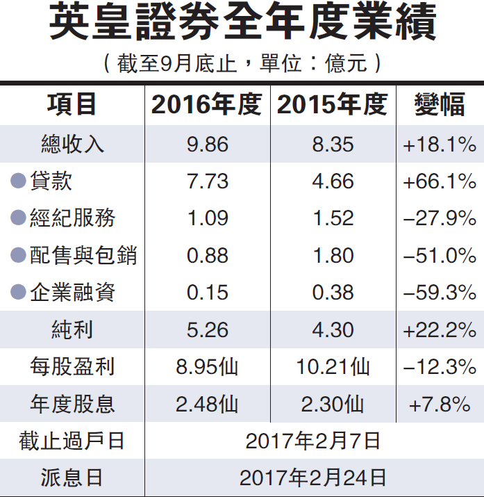 □英皇證券(00717)公布截至9月底之全年業績,期內收入上升18.1%至9.86億元,純利增長22.2%至5.26億元,主要由貸款業務增長所帶動,為集團貢獻7.73億元的收入;期內每股盈利8.95仙,較去年同期下跌12.3%,派末期息每股1.28仙。集團近日引入中國太平(00966)為策略股東,令母公司英皇集團股權被攤薄至不足四成。行政總裁楊玳詩表示,引入策略股東可為集團帶來新價值及資金,母公司股權攤薄非主要考慮因素;又指中國太平擁金融相關業務,與集團的合作空間大,但現階段未有仔細研究合作方案。\大公報記者 陳詠賢