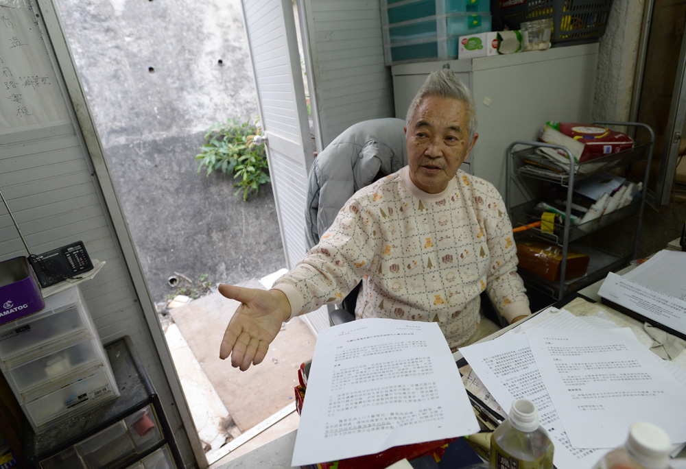 郭卓堅4F寓所側是霸佔公眾地方僭建的鐵皮屋辦公室,寓所門外又加建了鐵絲網圍封,違反清拆令六年,但郭依然故我繼續在僭建屋生活。記者昨日所見,用作東堤小築業主立案法團辦公室的僭建鐵皮屋原封不動,屋內擺放多盒雞精及零食雜糧,記者問郭是否買入食品轉售,他說見平價大量買入自用:「日日補吓(雞精)。」