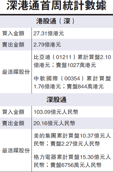 □深港通啟動首周,在外圍投資氣氛配合下,港股整個星期累升196點,扭轉上周跌市格局。綜合首五個交易日情況,內地資金利用港股通(深)平台買入港股金額達27.31億元;深股通買盤更大,累計金額達103億元人民幣。港股通(深)方面,以比亞迪(01211)、中軟國際(00354)交投最活躍;而北上深股通資金主力吸納格力電器、美的集團等兩大家電企業。」大公報記者 劉鑛豪