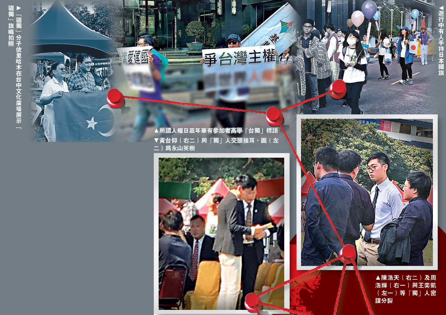 □黃台仰、陳浩天及周浩輝等「港獨」分子早前往台灣參加「世界人權日」嘉年華,但《大公報》記者現場直擊後,發現嘉年華只是分裂活動幌子,大批主張「港獨」、「台獨」、「疆獨」及「蒙獨」的「獨派」分子在活動上沆瀣一氣,以爭取人權為名,行分裂之實。本報調查發現,這些「獨派」團體竟都與日本有深厚關係,嘉年華會場亦有不少日本人神出鬼沒,更有參加者高舉日本旗幟,「獨派」背後的日本勢力已經浮出水面。黃台仰及陳浩天等「港獨」分子竟欣然投靠這些陰謀分裂中國的日本人或親日團體,甘願充當其馬前卒。/大公報記者 李文威(文/圖)